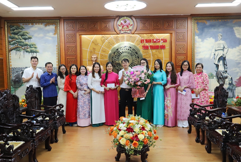 | Lãnh đạo Văn phòng UBND tỉnh tặng hoa chúc mừng và ghi hình lưu niệm cùng nữ công Văn phòng nhân ngày 20/10. |
